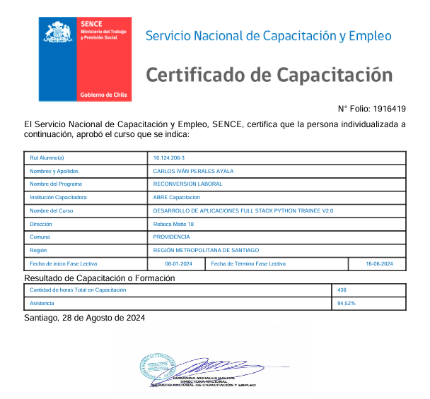 - Desafío Latam: Desarrollo de aplicaciones Full Stack PYTHON (462 horas) (2024)
